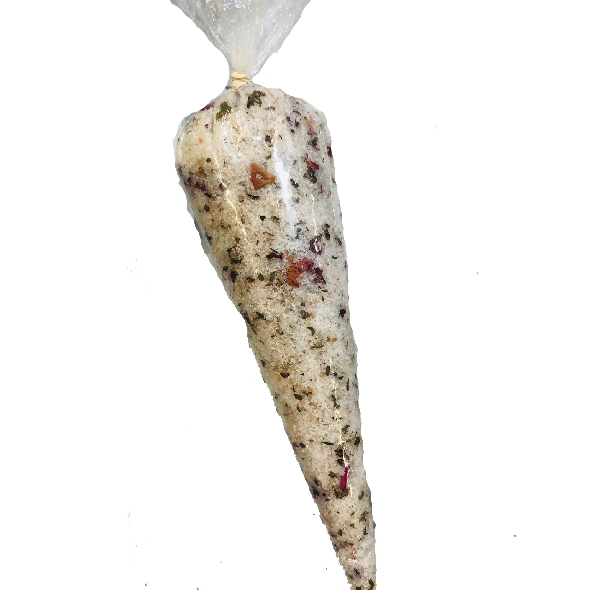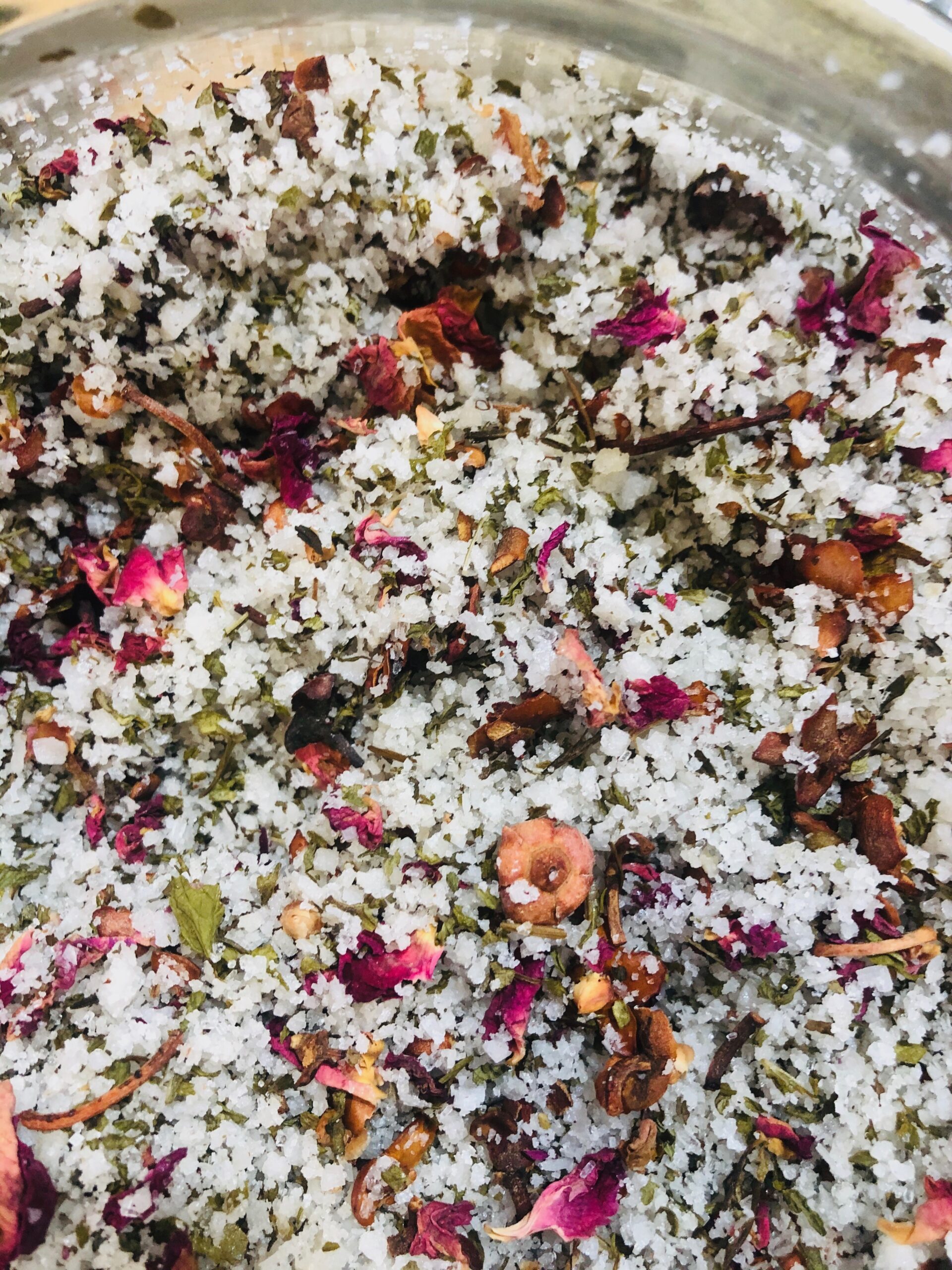 Relax bath salts make our of linden flower rose petals and fresh touch of peppermint. Come in a bag for $11, or $20 a pound.